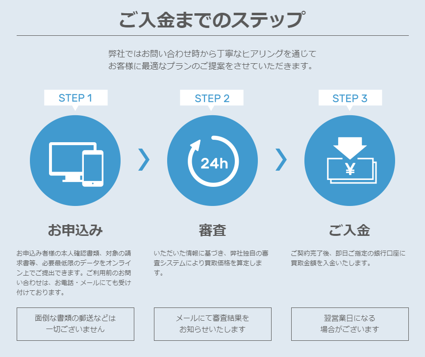 お申込みから審査、ご入金まで最短 24 時間以内で対応いたします。